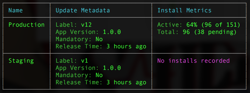 code-push-standalone deployment ls <appName> [--displayKeys|-k]