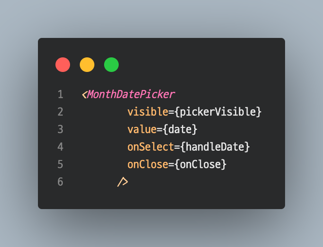 위 같이 MonthDatePicker Component는 visible, value, onSelect, onClose이라는 Props를 가지고 있습니다.