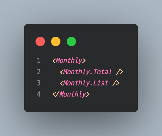 Monthly는 Context API와 내부 Child로 사용할 수 있는 Component를 포함하고 있습니다. 이렇게 Monthly 내부의 값은 useContext를 사용하여 Monthly Context 값을 전파 받을 수 있습니다. (useContext를 반복해서 입력하기 귀찮으니 이것도 분리하여 useMonthly로 만들어 줍니다.)