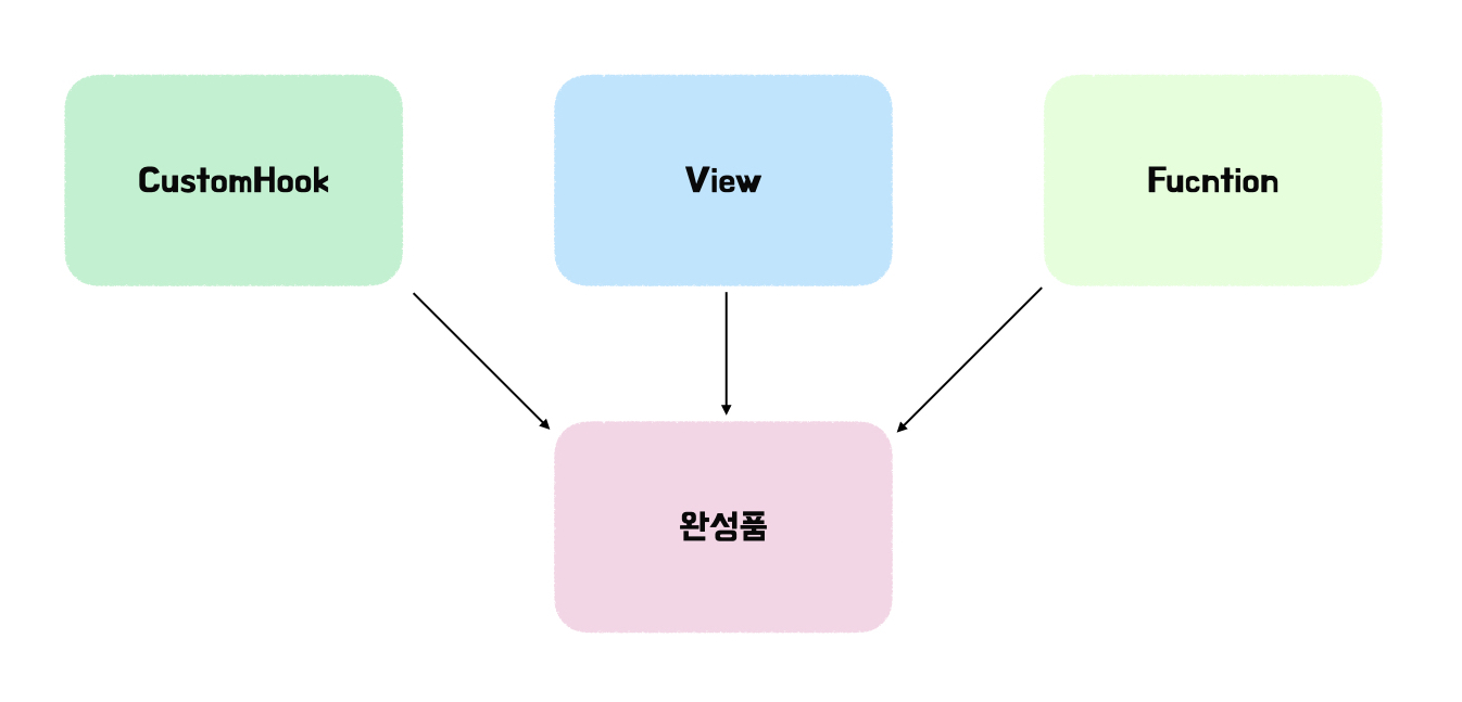 그래서 저는 비대해지는 컴포넌트를 아래와 같이 쪼갰습니다. 상태와 기능은 CutomHoook으로 View는 View대로 나눠 한 파일의 코드분량을 적게 유지하고 싶었습니다. 작은 부품들로 만든 후 하나로 합쳐 완성품을 만들고자 했습니다.