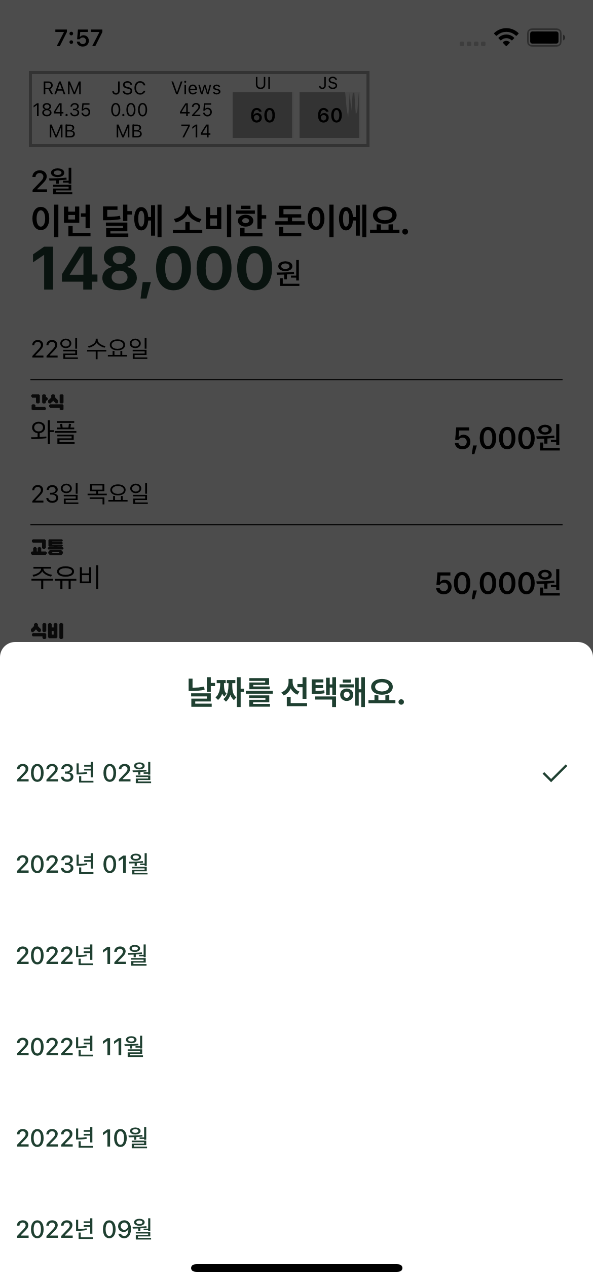 잠시 useDate라는 CustomHook에 대해 설명을 드리려고 합니다. 서버까지 만들어 관리하면 운영비와 서버 설계까지 해야 하는 것은 너무 과하다고 판단했고 Severless 구성으로 만들기 위해 해당 앱의 서버는 Firebase로 구성되어 있습니다. DB는 Realtime Datebase로 No SQL을 사용하고 있습니다. 내가 원하는 날짜의 데이터 값을 DB에 요청해 받아오면 Total과 List에서 사용할 수 있게끔 데이터를 정리하는 로직과 데이터는 날짜를 조건으로 전달해주기 때문에 날짜 값과 날짜를 수정할 수 있는 값 또한 가지고 있습니다. 아래와 같이 값을 리턴해줍니다. (total은 분리해서 Total Component에 넣어도 될 것 같네요.)