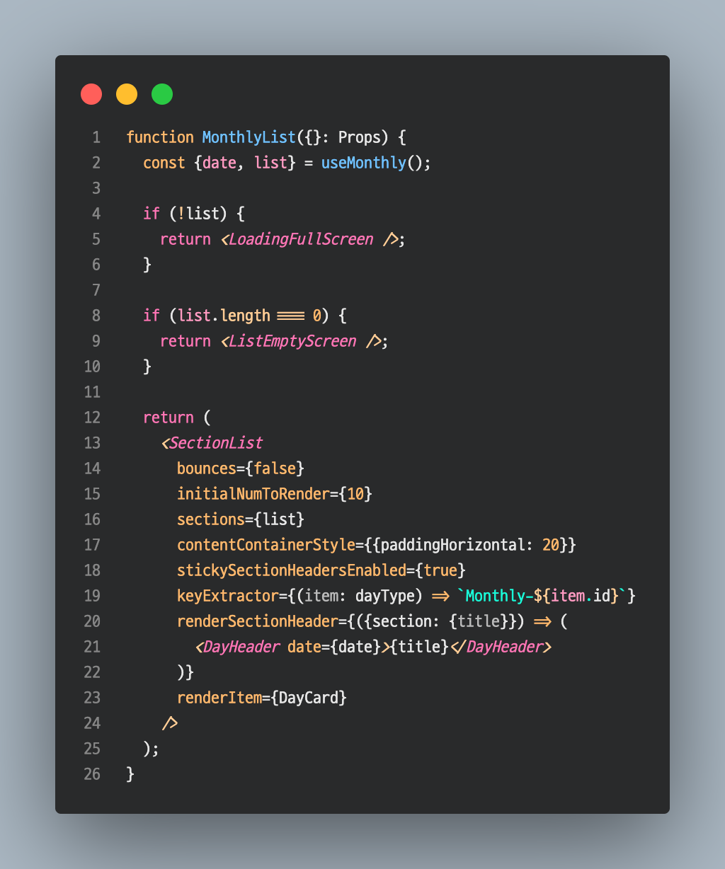 MonthlyList와 MonthlyTotal은 Component내에 useMonthly만 호출하여 사용하고 View만 신경 쓸 수 있게 됩니다.